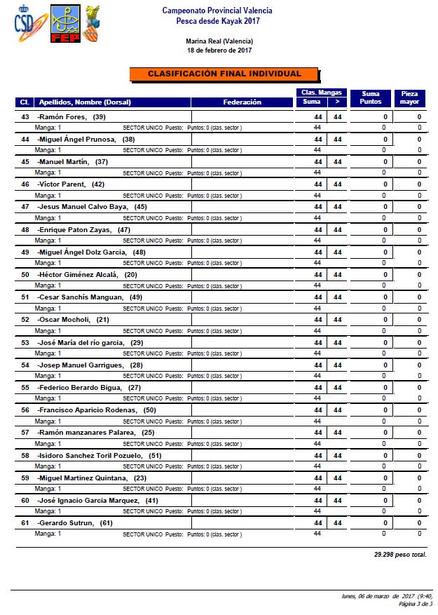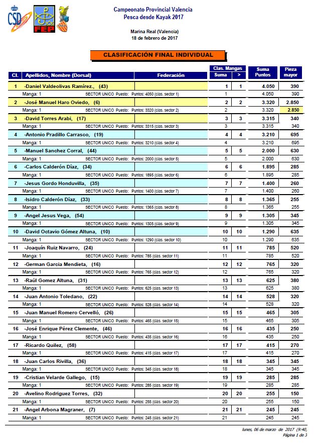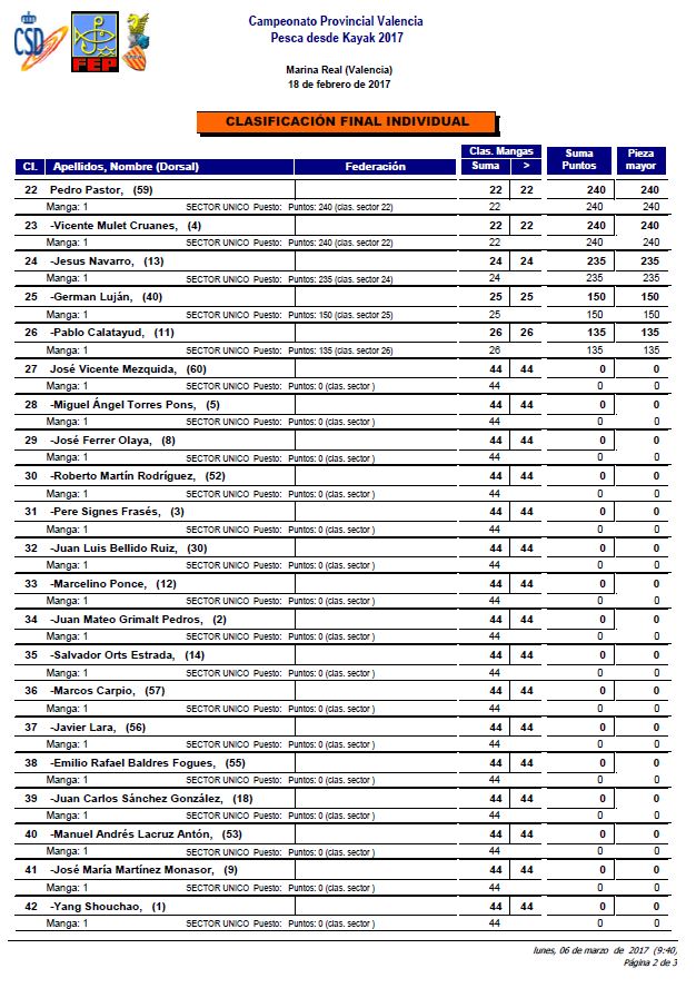 El II Campeonato Provincial de Pesca desde Kayak tuvo lugar en La Marina Real (Sur) Juan Carlos I (Valencia) el 18 de febrero de 2017.